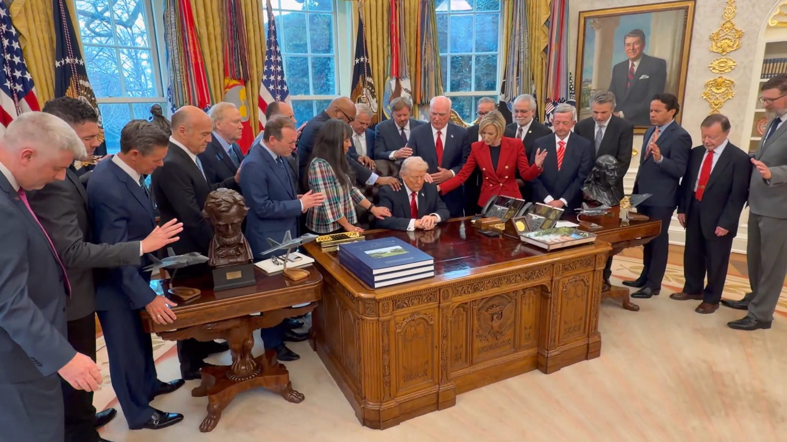 La mise en scène montre le président Trump, entouré d’un groupe de 20 pasteurs qui prient pour lui et pour approuver son action. Mais attention, ces « pasteurs » ont été choisis avec soin : ils sont très majoritairement sionistes, les deux plus notables dans cette réunion étaient Paula White-Cain (en rouge) et Greg Laurie (à sa droite), sionistes pur-jus.
